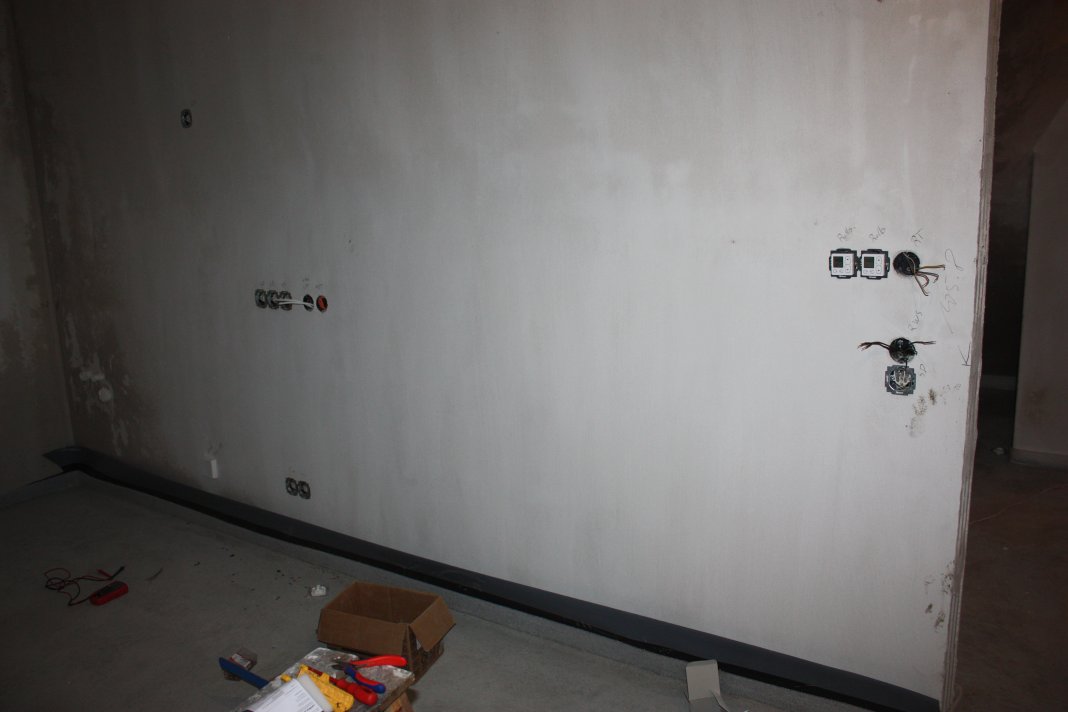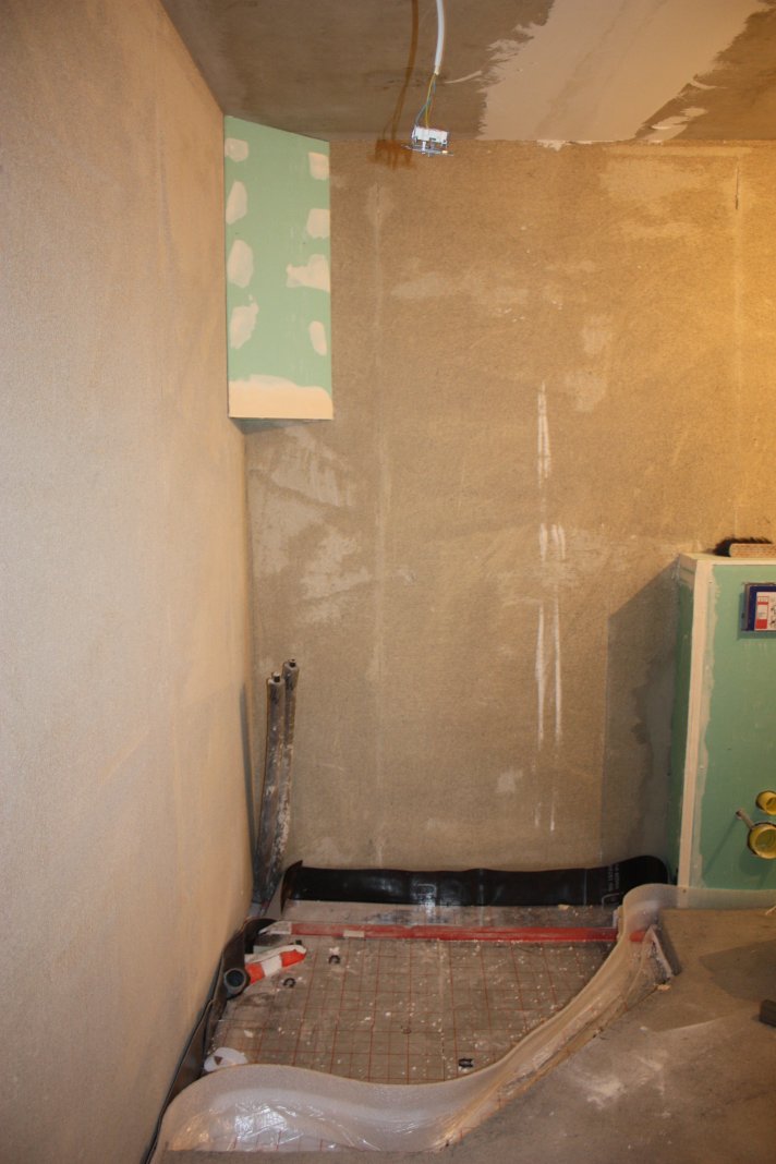 Die FA Glück hat heute den Trockenbau abgeschlossen, im Kellerbad haben wir das Rohr mit einem Dreieck verkleidet, um die Form der späteren Badewanne aufzunehmen und über dem Sicherungskasten gab es einen Kasten, um die Kabel zu verdecken.