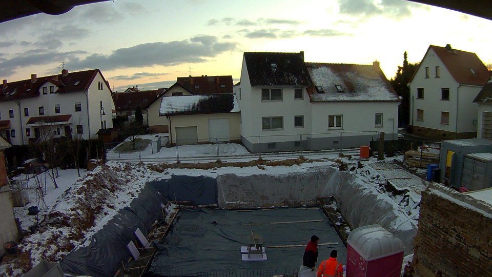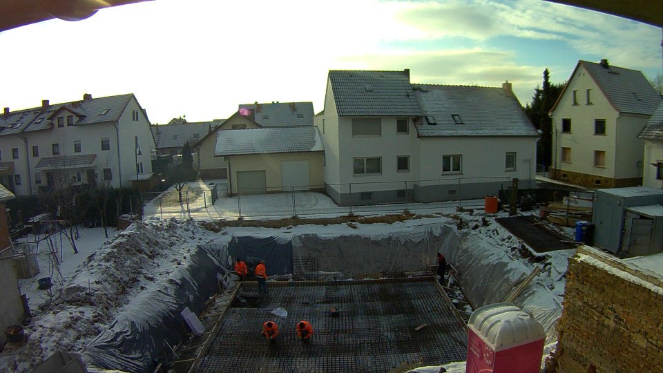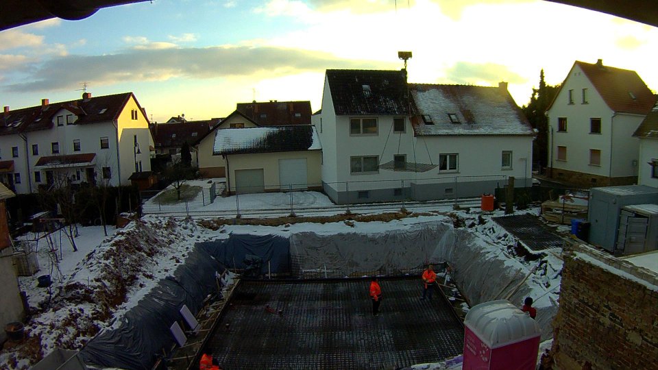 Die Plane hat sich gelohnt, sie hat das Eindringen von neuem Schnee und Eis verhindert. Und es geht damit weiter, die Armierung aus Stahlmatten zu verbinden, daher sind heute fünf Mann auf der Baustelle. Unser Stahlmattenstapel schwindet immer mehr.