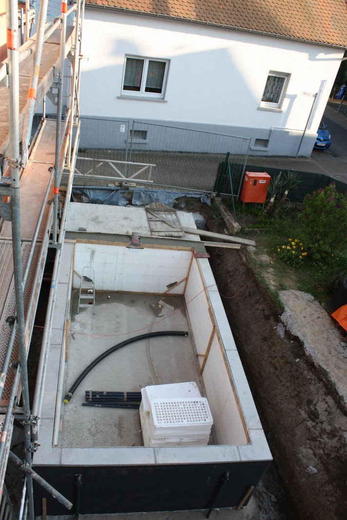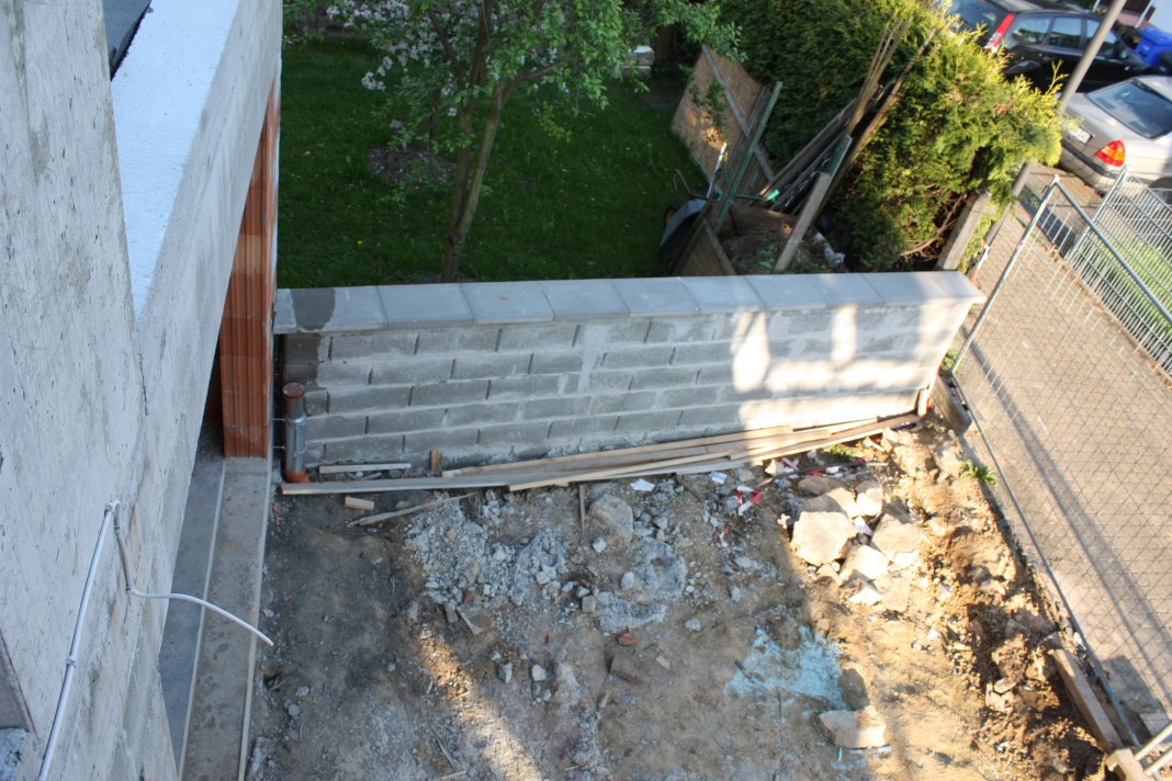 Die Abdecksteine wurden auf die Mauer zum Nachbarn geklebt und am Pool wurde der Rand fertiggestellt.