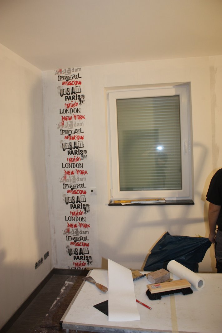Heute war das Wetter gut, so konnte ich die Randplatten der Dachterrasse grade verlegen, anschließend haben wir die ersten Streifen im Büro tapeziert.