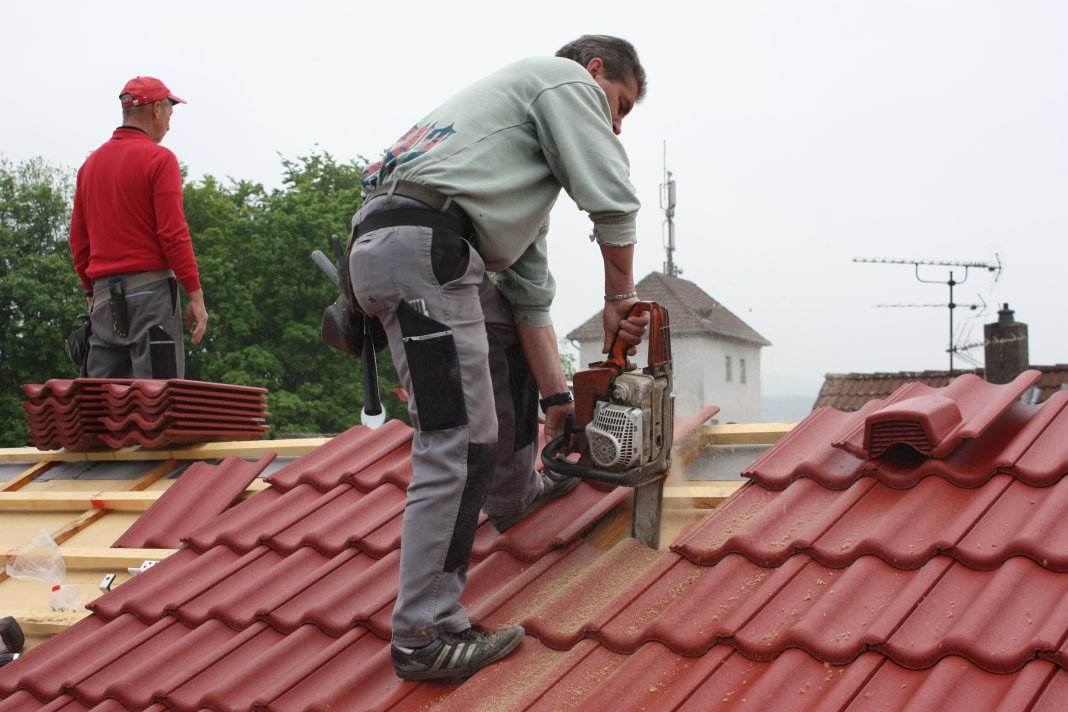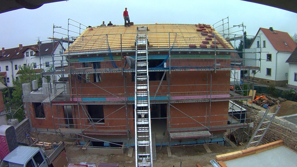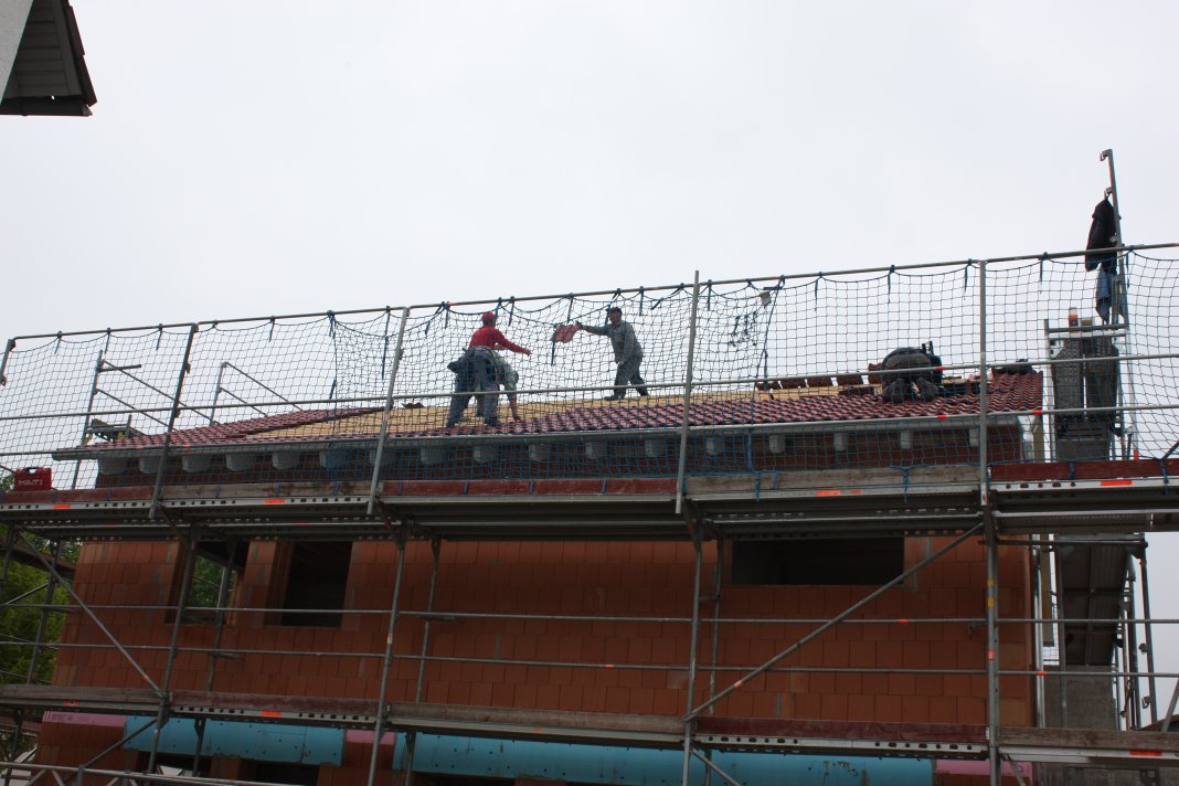 Währenddessen hat die Firma Löw das Dach zum Fliederweg eingedeckt, unser Dachfenster eingebaut und die Sonderziegel für Abwasserentlüftung, Gasheizung, Sat- und Solaranlage angebracht.