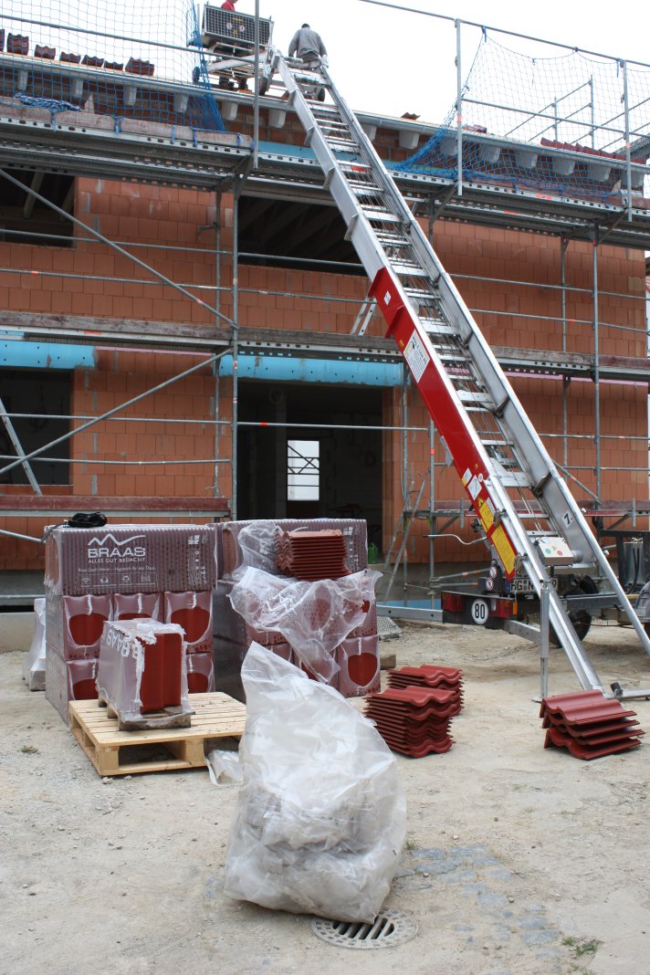 Nun war es soweit, die Dachdecker haben ihren Lift aufgebaut und die Ziegel sind geliefert worden.
