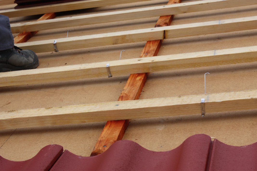 Zum Schluss kam die Firstlattung auf das Dach, auch hier wurde eine Abdichtung angebracht und die Firstziegel beidseitig festgeschraubt.