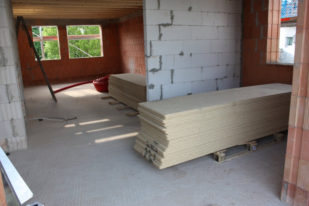 Wir haben, da morgen die Fenster kommen, die ESB- Platten auf den Dachboden gewuchtet und grob verteilt.