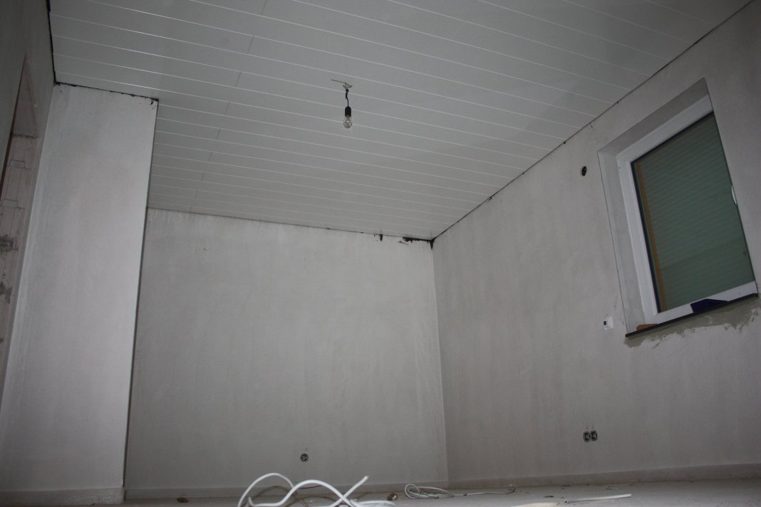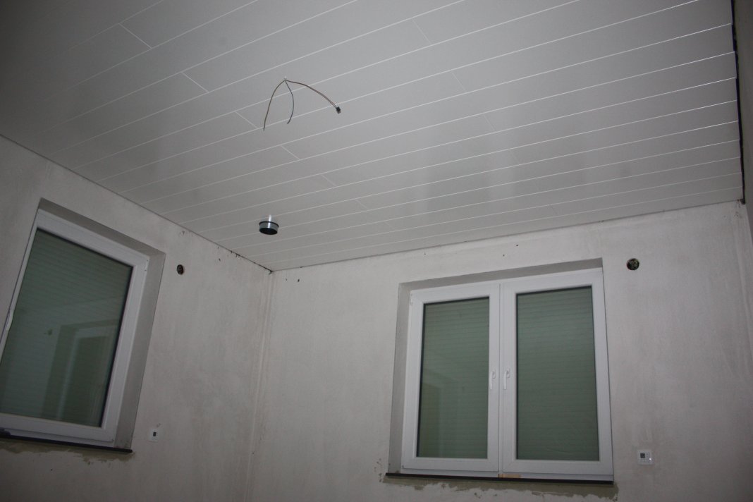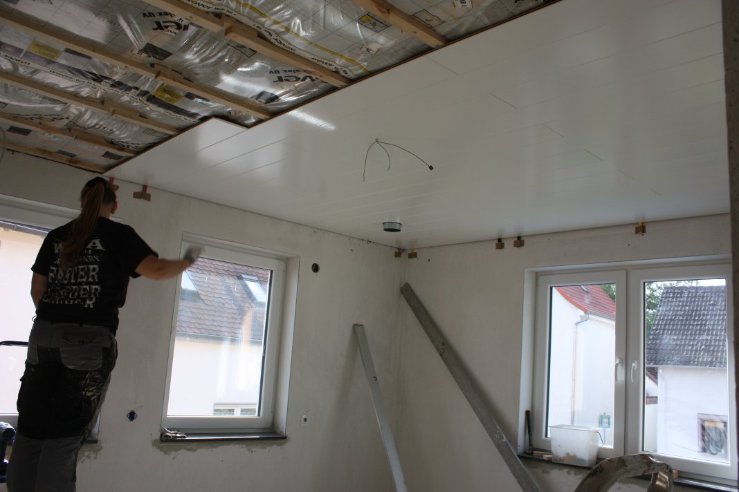 Nachdem wir ausgeschlafen hatten, (ist ja Feiertag) haben wir mit der Paneelendecke im Schlafzimmer angefangen, das hat auch ganz gut geklappt, so dass wir gleich noch die ersten drei Reihen im Wohnzimmer hinterher geschoben haben.