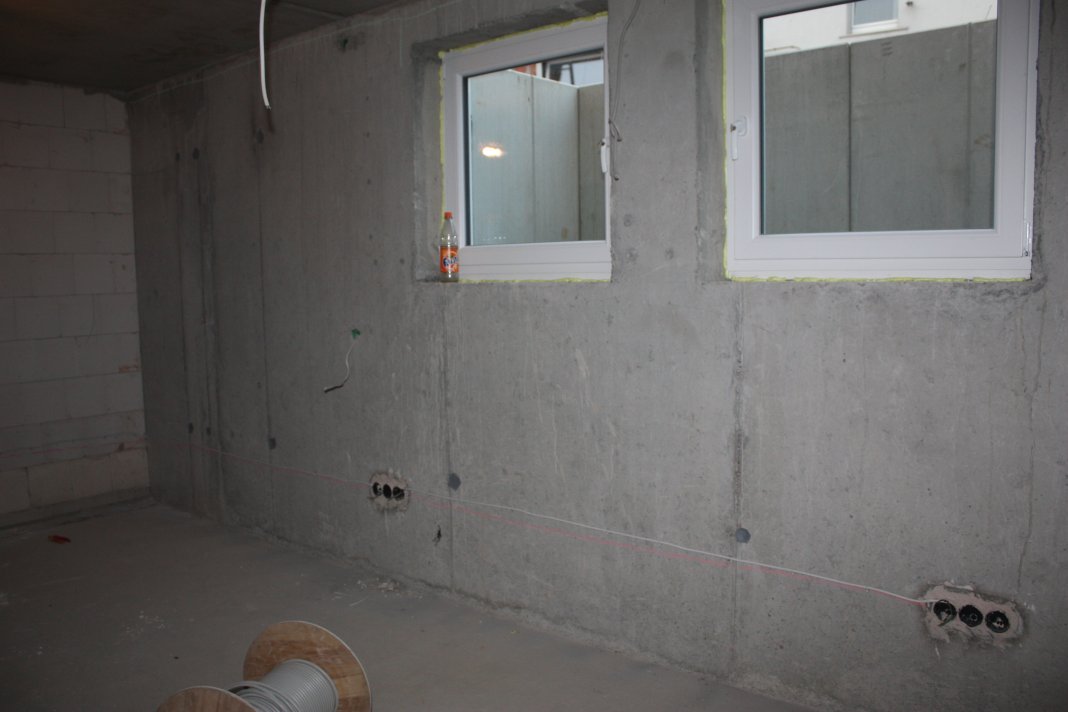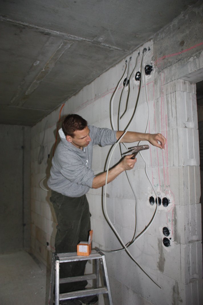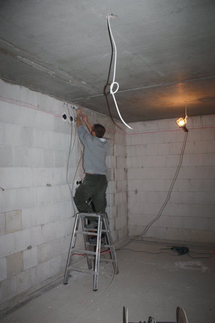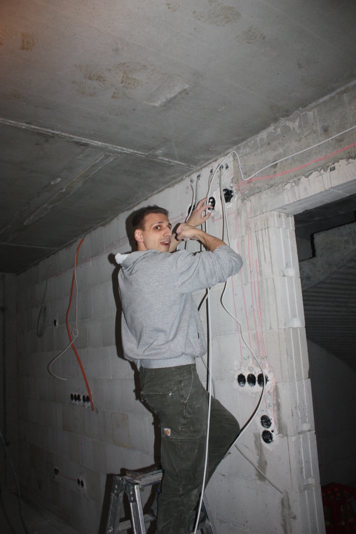 Am Nachmittag ging es dann weiter auf der Baustelle. Wir haben die Kabel im Keller verlegt. Donk hat eine steile Karriere hingelegt, zunächst vom Dübeleinklopfer, zum Dübellochbohrer bis er beim Kabelziehen, Abisolieren und in die Dose stecken angekommen war. Das Ergebnis kann sich sehen lassen, wir haben die beiden Kinderzimmer im Keller verkabelt. Ich habe währendessen den Verteilerkasten im Keller gesetzt und alle Kabel eingeführt.