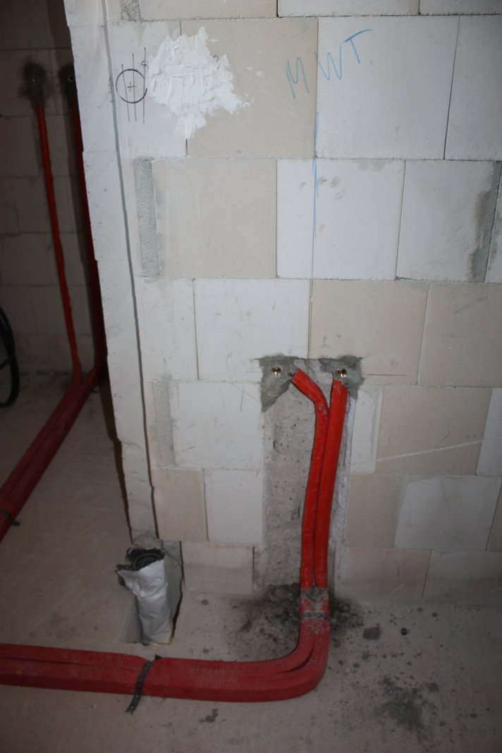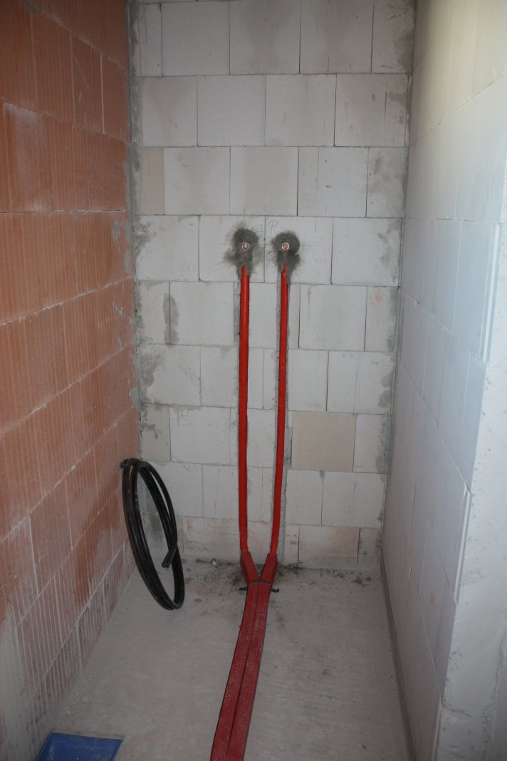 Heute ist die Firma Schmalz durch Addy und Thorsten vertreten, und es geht schwer voran, im Bad des Obergeschosses werden die Duschanschlüsse gestemmt und verlegt, ebenso die Anschlüsse für Badewanne und Waschbecken.