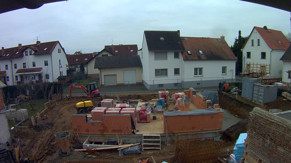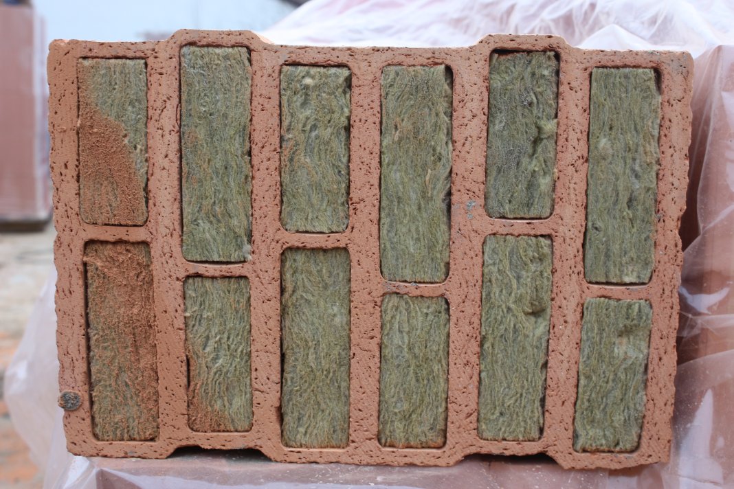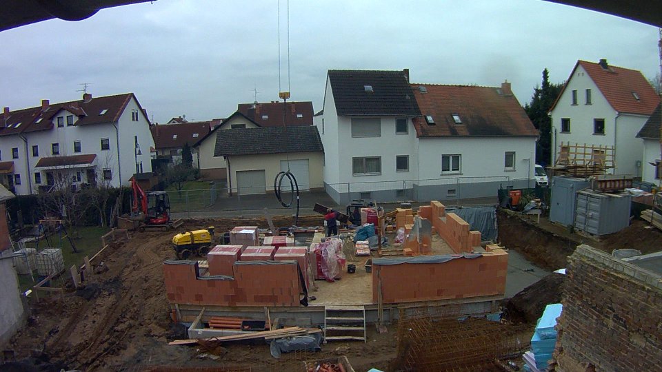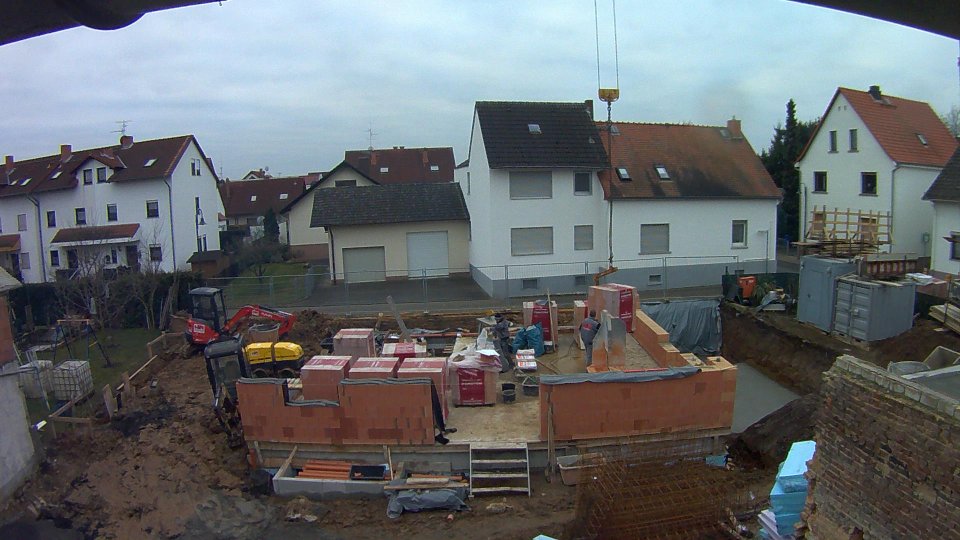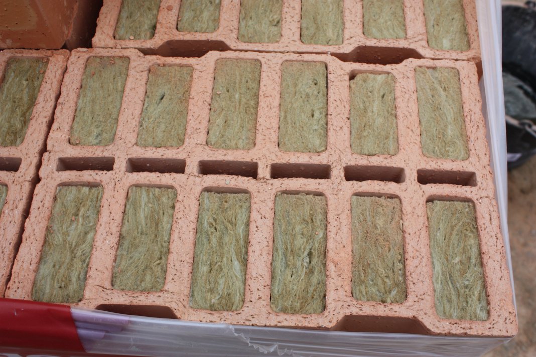 Heute wurde mit geringer Priorität gemauert. Wir haben zwei Typen von Steinen, einmal Ziegel mit durchgehender Mineralwolle und einmal mit Stegen in der Mitte. Die Steine von der zweiten Sorte werden zersägt, um halbe Steine zu haben ohne die Mineralwolle zu verlieren.