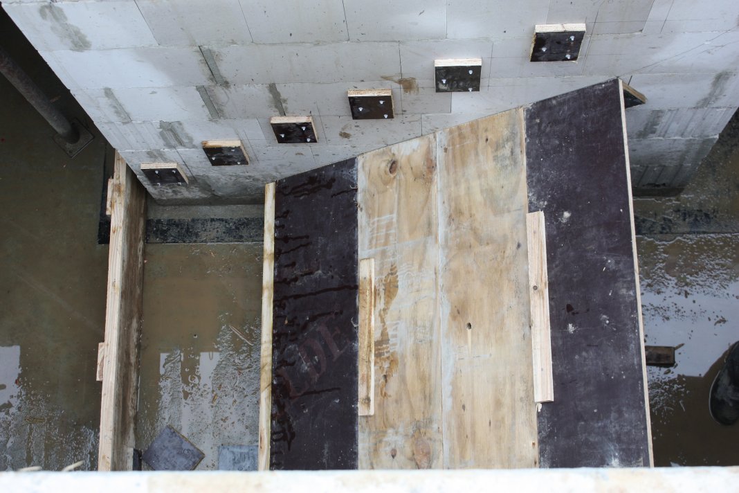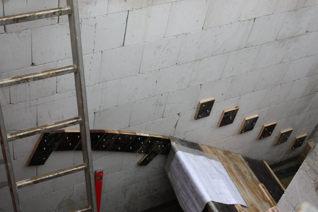 Mit der Verschalung der Treppe wurde begonnen. Das ist wirklich eine Arbeit für Geduldige: Für jede Stufe zwei Brettchen an die Wand und dann noch die Verschalung von unten, Stufe für Stufe, die ersten 6 Stufen sind schon vorbereitet.