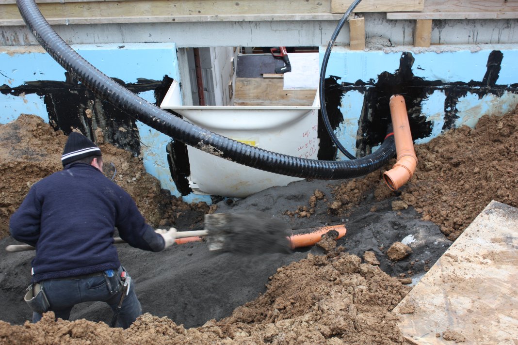 Vor dem Haus wurde an den Abflussrohren gearbeitet. Regenwasserüberlauf und Schmutzwasser wurden Richtung Kanal geführt, ebenso die Kaltwasserleitung und die Erdleitung zum Pool.