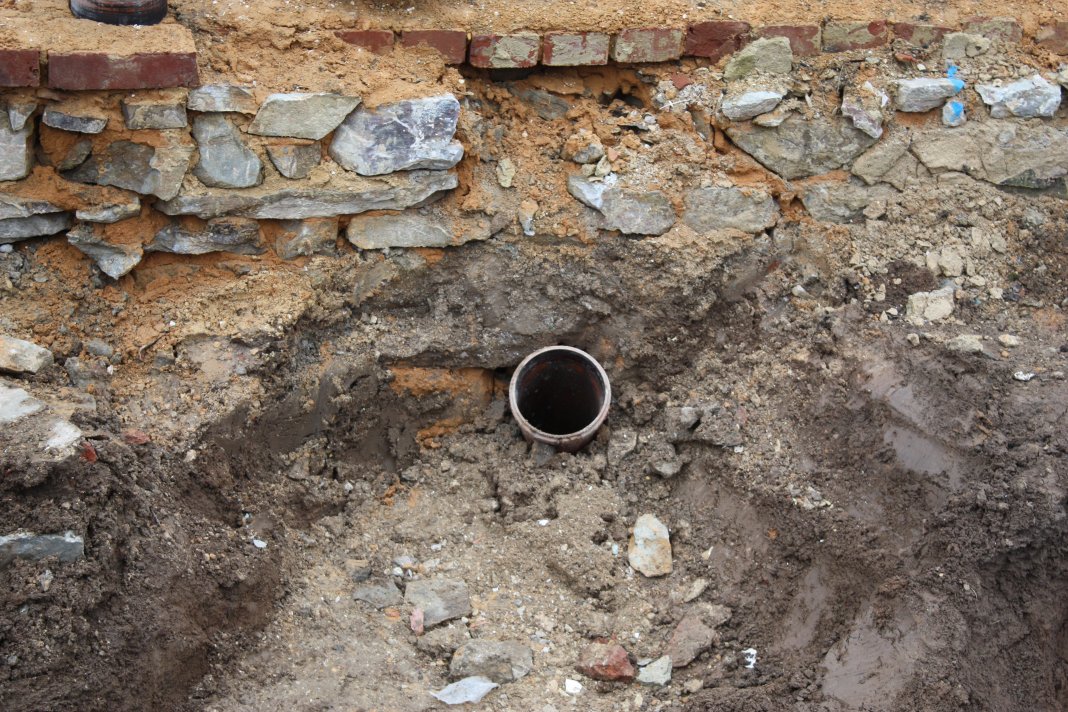 Dieser Anschluss bereitet uns noch Sorgen, denn anscheinend verläuft er nicht steil in einer Linie zum Kanal, sondern hat noch einen Knick. Aus Erzählungen der Schwiegermama wissen wir, dass die Stadt bei der Erschließung den Kanalanschluss zunächst in den Garten gelegt hat und erst dann an die Backstube angeschlossen hat. Wir nehmen an, dass die Stadt dafür keinen neuen Anschluss gelegt hat, sondern nur den Knick eingebaut hat. So werden wir morgen mit der H&R abstimmen, wie wir den Anschluss umsetzten.