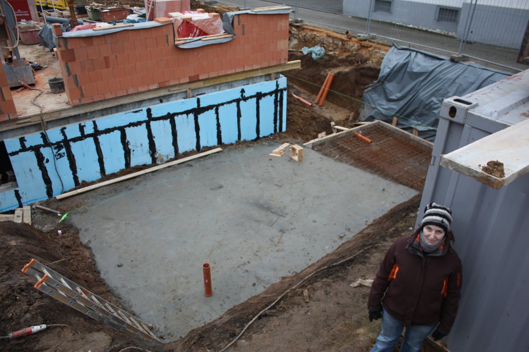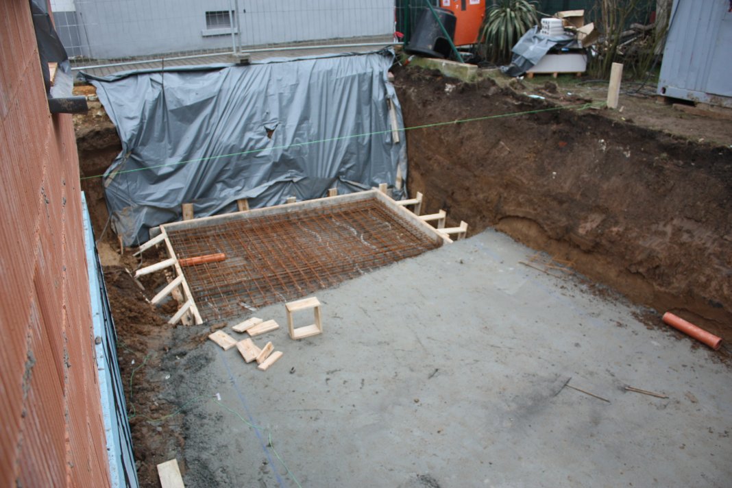 Die Bodenplatte für den Pooltechnikraum ist verschalt und mit Armierung versehen worden.