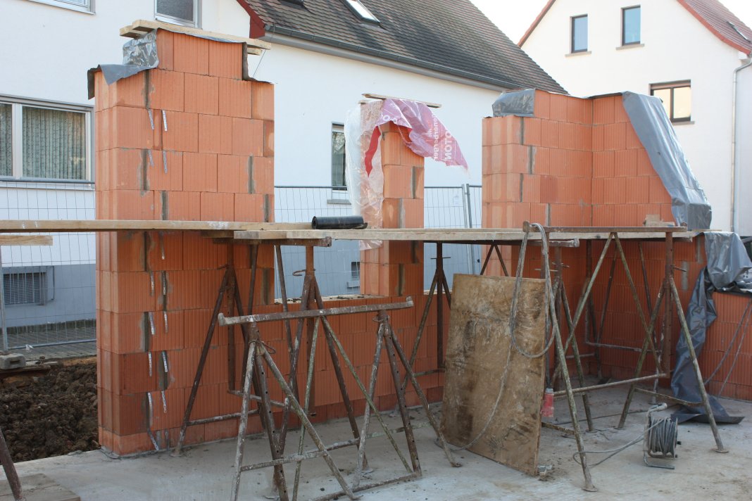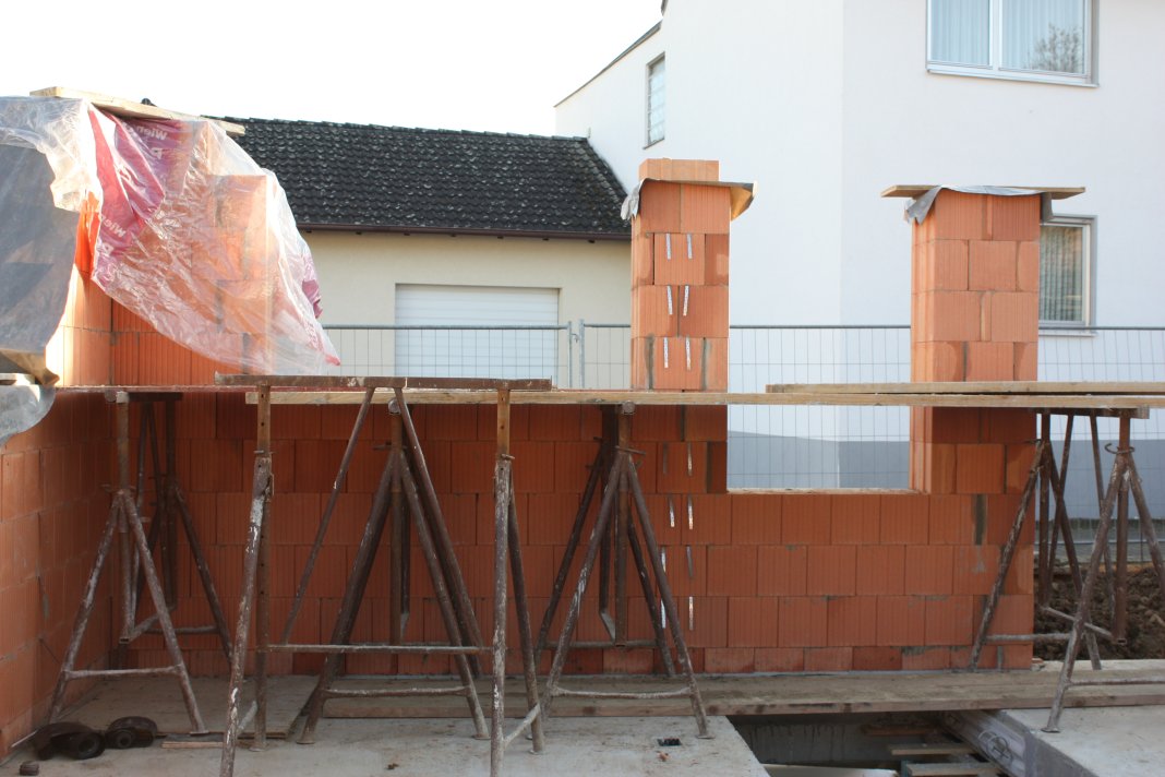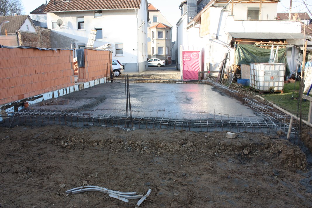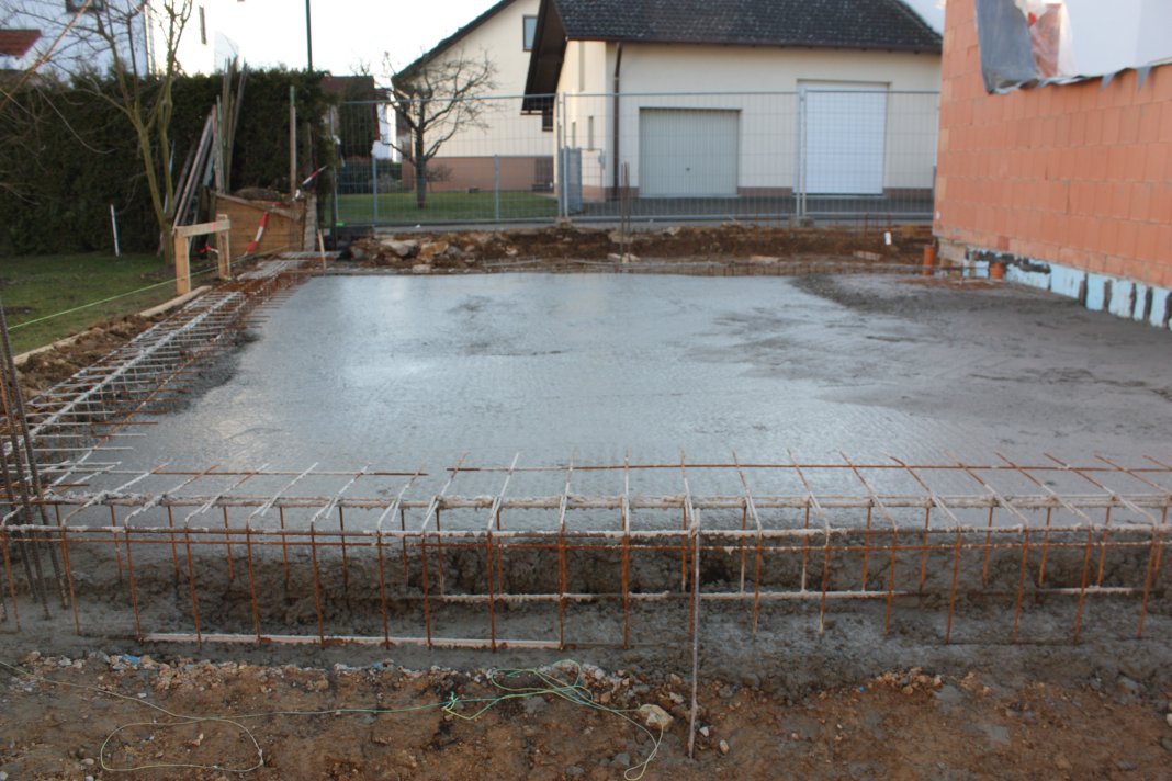 Die Armierung des Garagenfundaments ist abgeschlossen.Das Fundament und die Sauberkeitsschicht konnten gegossen werden, ebenso die Grundstücksbefestigung zum Nachbarn. Hier wurden gleich noch ein paar Eisen für die Mauer vorgesehen.