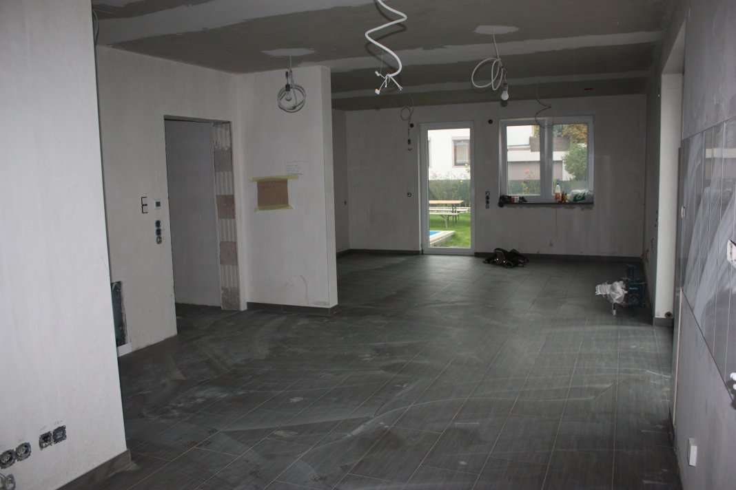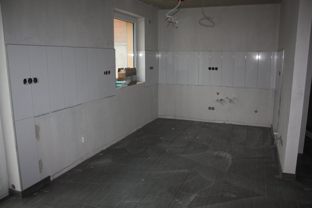 In unserer Küche ist der Fliesenspiegel gefliest, das EG ist mittlerweile auch fertig gefliest.