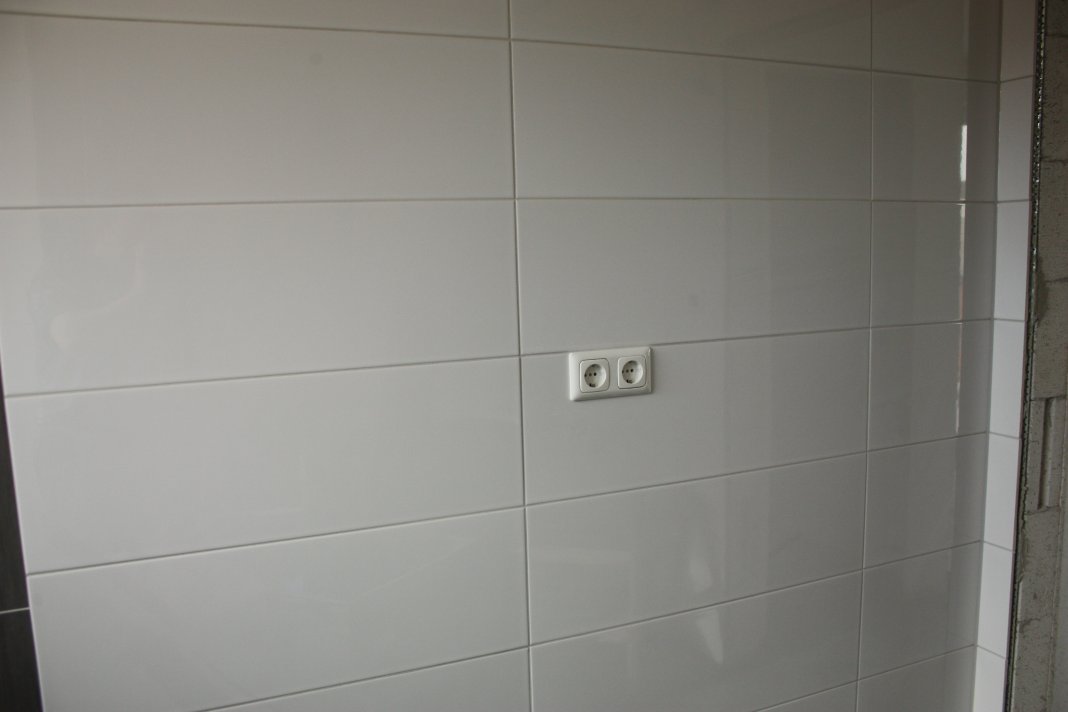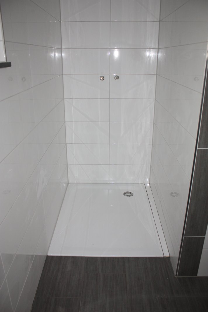 Die Duschwanne in OG ist auch fertig, hier mussten wir leider an der Seite ein Fliese auf den Boden setzten, da die Breite der Dusche zu klein geworden war nach dem Verputzen.