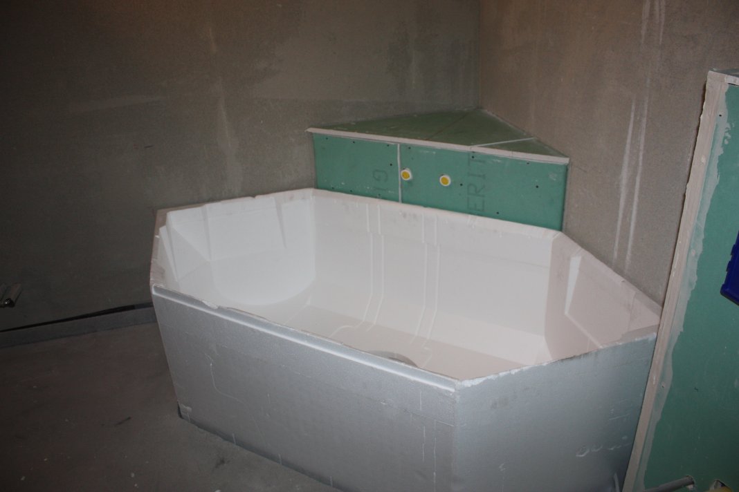 Die Badewanne ist geliefert und im Keller ist der dafür vorgesehene Träger im Bad bereits plaziert worden.