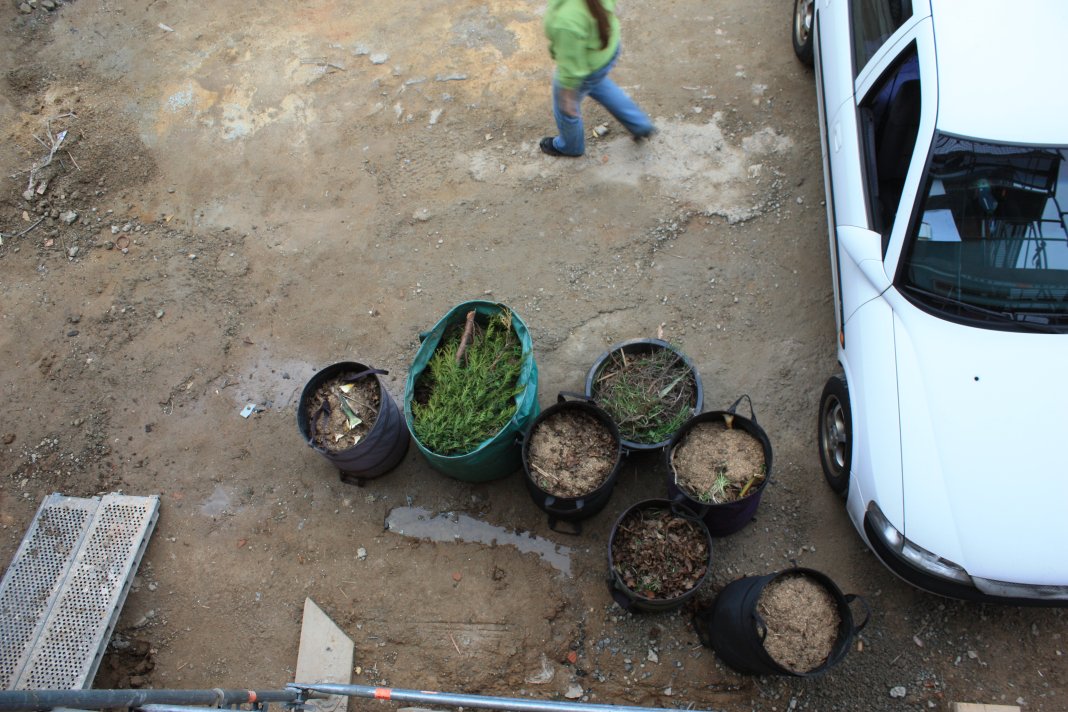 Die Palmen wurden wieder auf Vordermann gebracht und anschließend die Reste des Dachstuhls in Eimer zusammengetragen, damit wir sie zum Entsorger fahren können.