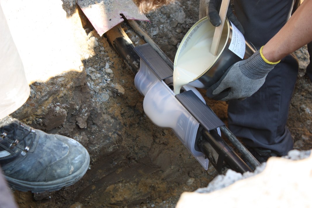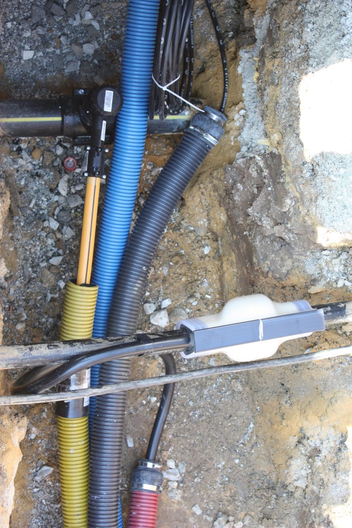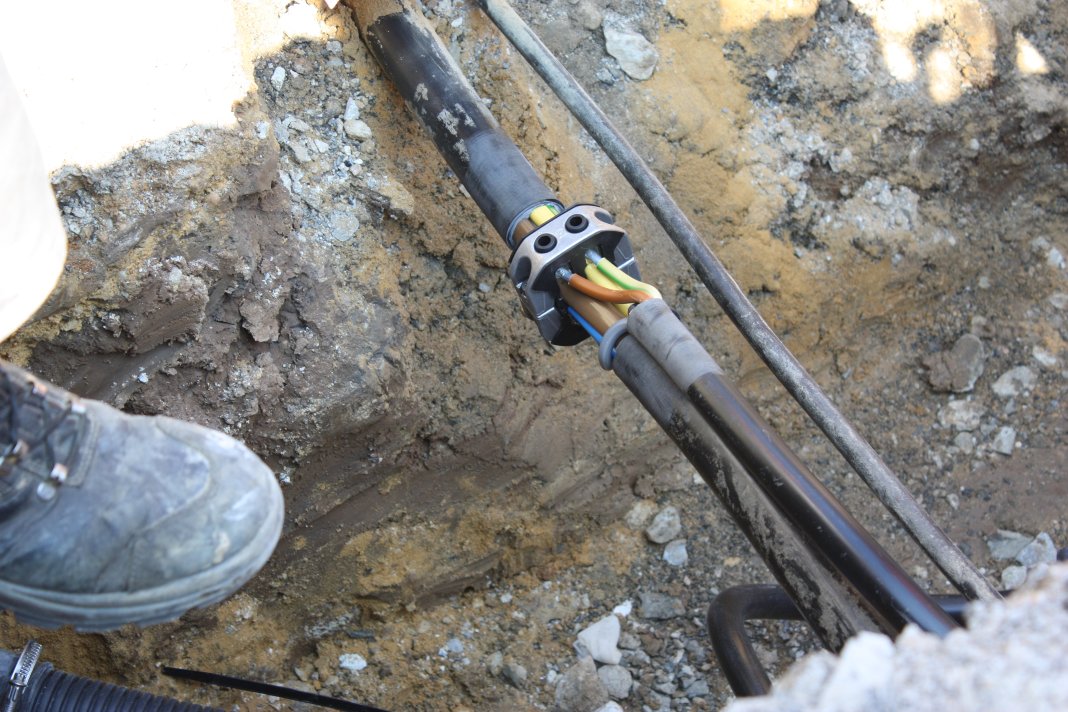 Das Kabel in der Straße wurde abisoliert und anschließend eine Klemme aufgesetzt, die sich in das Kabel bohrt und an der unser Kabel angeklemmt wurde. Dann wurde das Ganze vergossen und schon war der Stromanschluss fertig.