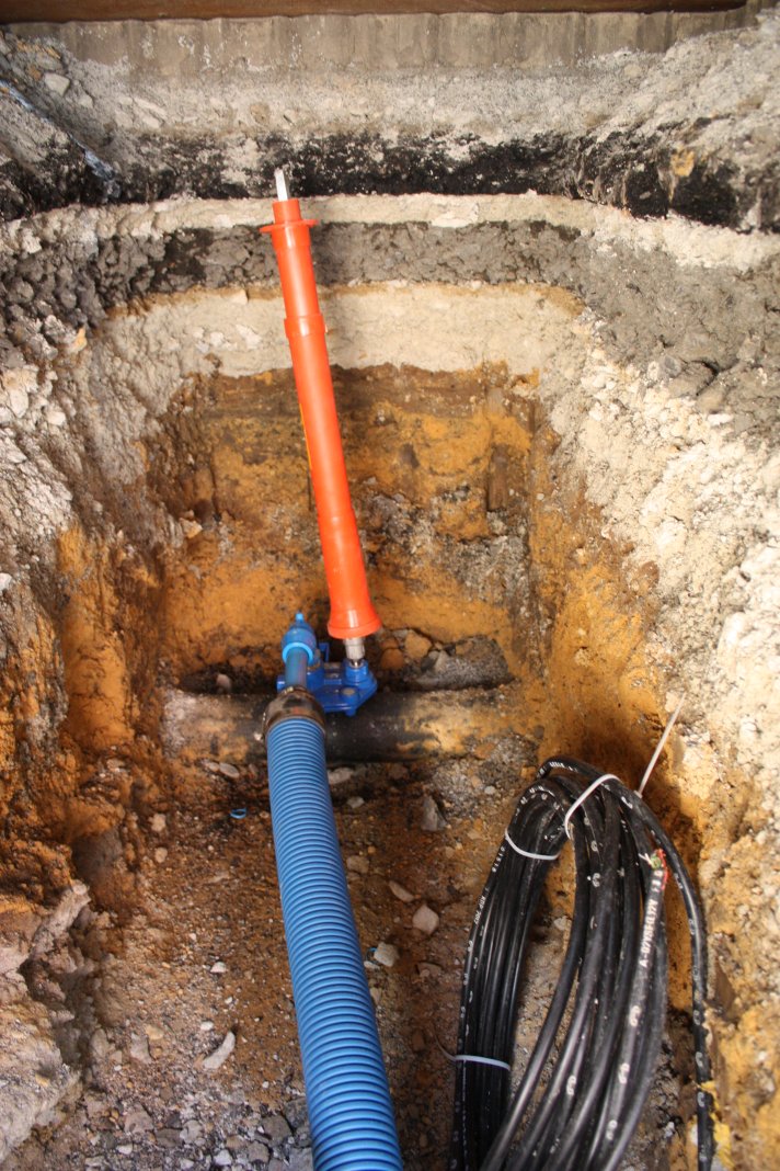 Am Mittag kamen die Stadtwerke und haben die Wasserleitung angebohrt und auch diese durch die Mehrspartenwandeinführung geführt.