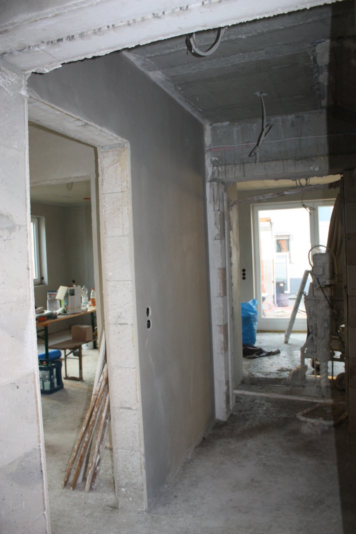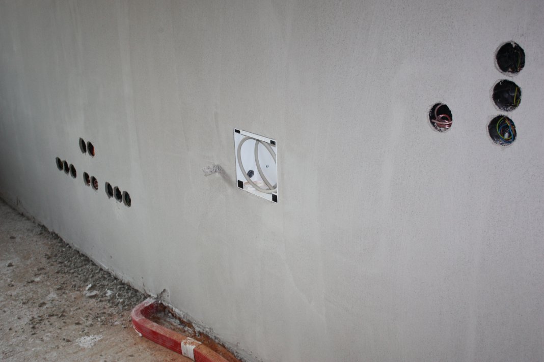 Die Verputzer haben das EG bis auf einen Teil des Vorratsraums fertig verputzt, so dass wir wieder die Steckdosen freigelegt haben.