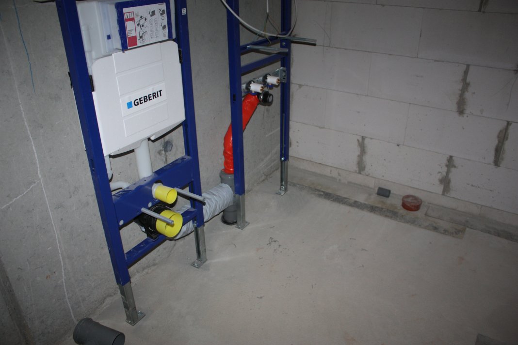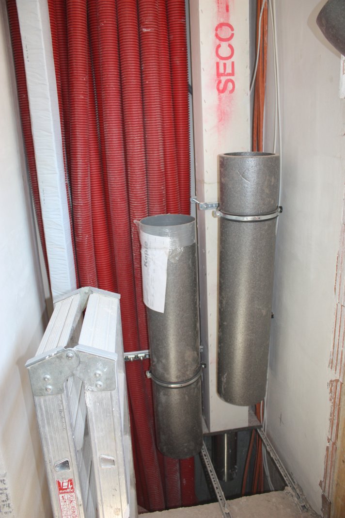 Die Dusche im EG und die Badewannenanschlüsse und -abfüsse wurden montiert, ebenso teilweise die Zu- und Abluft der Lüftungsanlage. Der Platz im Schacht wird langsam eng, hier wird die Rohrführung nochmal optimiert, aber nicht heute.