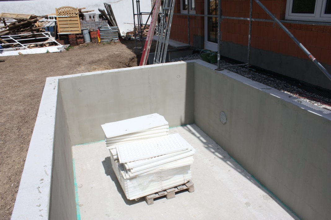Wir haben die Poolwände mit Fliesenkleber und Armierungsgewebe verspachtelt.