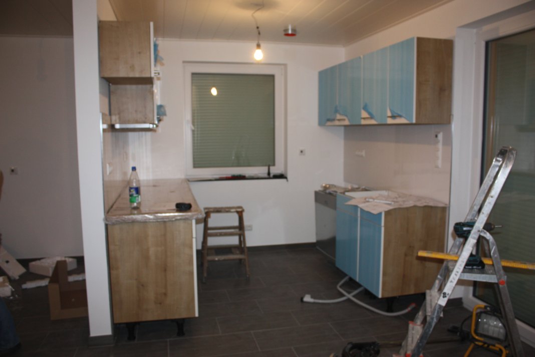 Gemeinsam mit Jürgen habe ich die Schränke der Küche im OG aufgehängt. Ich hatte ganz schön Bammel mit dem Schrank am Terrassenfenster, denn da laufen SEHR VIELE Leitungen und mein Prüfgerät war nie auf Grün, also habe ich an einer orangen Stelle gebohrt…. hat geklappt.