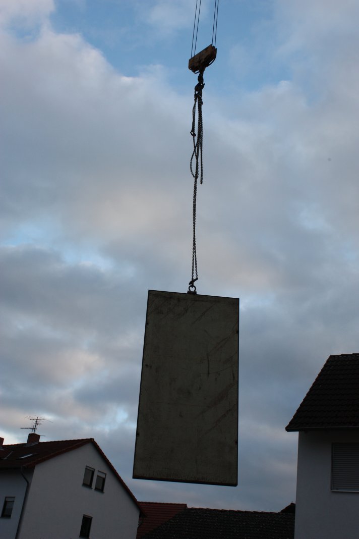 Nun schwebten die Schaltafeln heran und wurden am Boden verschraubt.