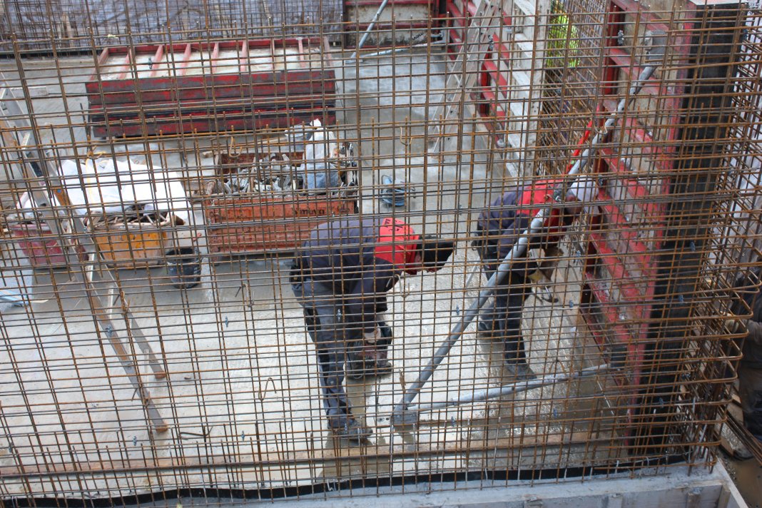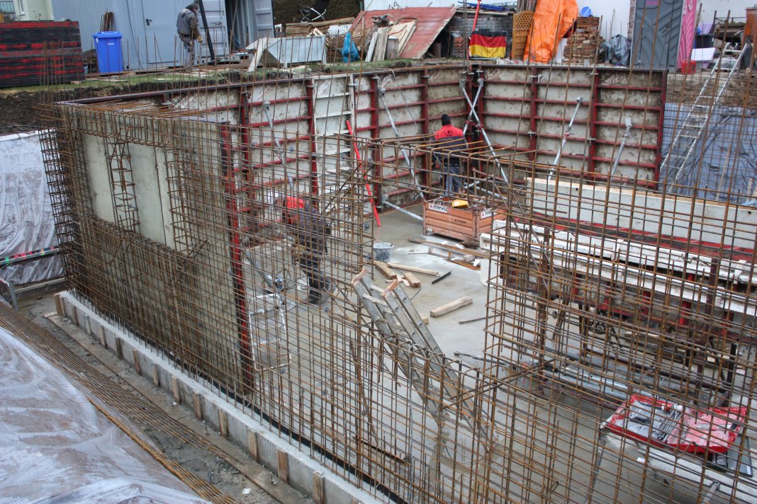 Da wir nicht so viel Lagerplatz haben bei dem großen Loch und es logistisch auch keinen Sinn macht, so viel Material für das Verschalen heranzukarren, wird zunächst der halbe Keller betoniert und anschließend die andere Hälfte.