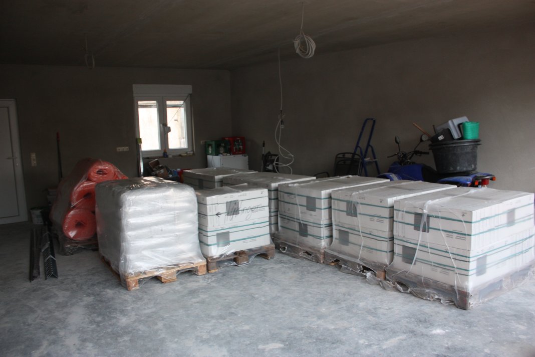 Heute wurden 260m² Bodenfliesen, eine Palette Kleber und eine Palette Grundierung, Winkel usw. geliefert.