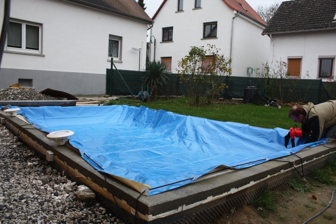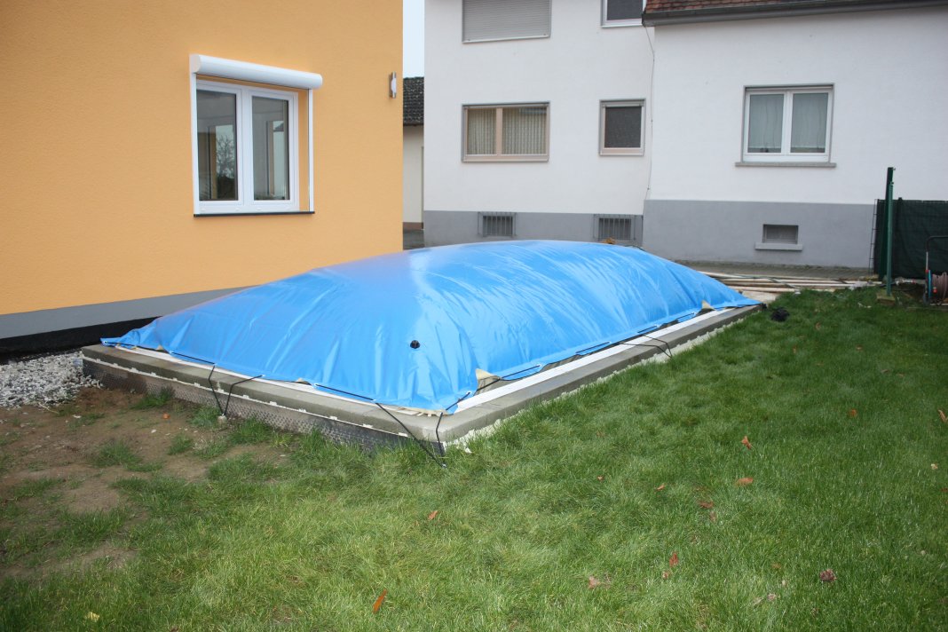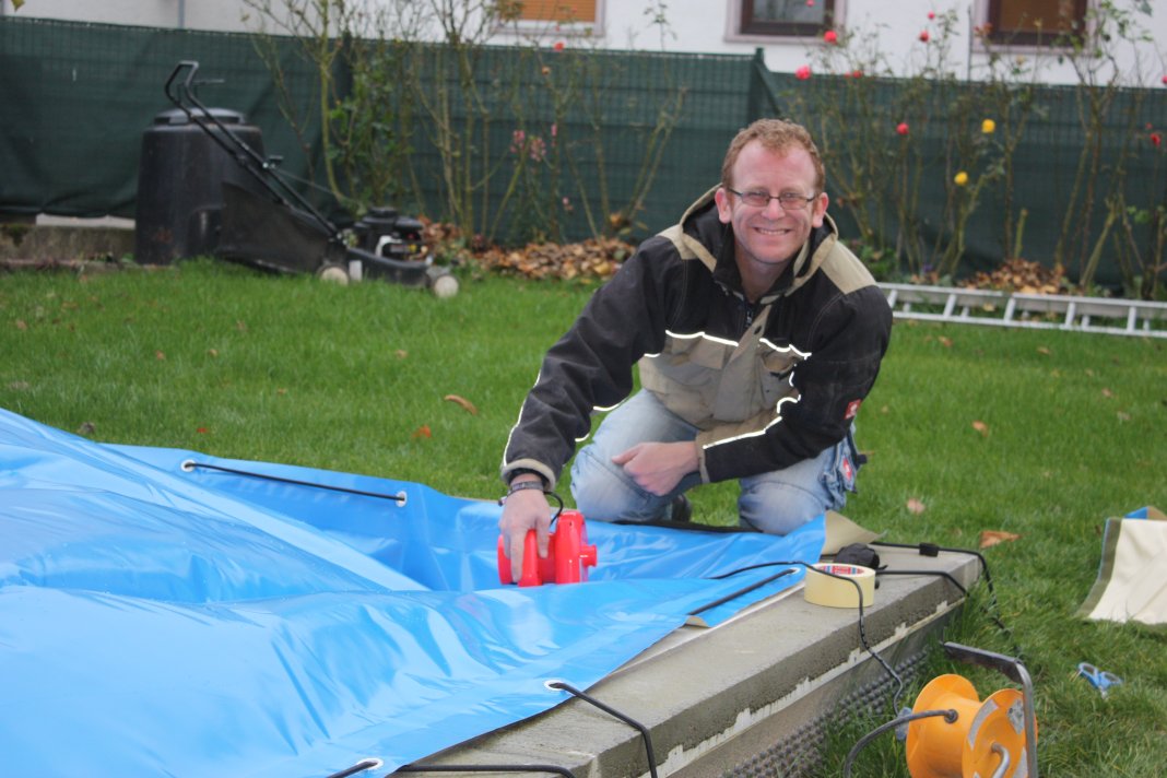 Jetzt konnte an den Pflöcken die neue Winterplane befestigt werden. Das ist eine besondere Kuppel- Variante, die man aufblasen kann. So soll das Becken vor Dreck, Regen, Schnee und Sonneneinstrahlung geschützt sein.