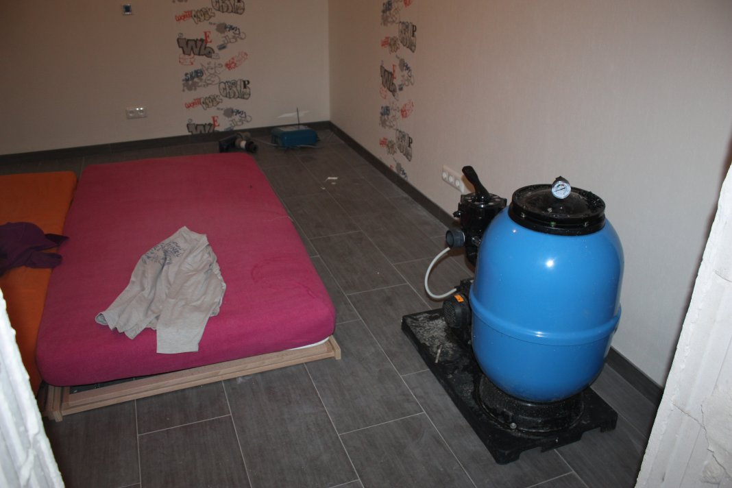 Anschließend wurde im Technikraum die Pumpen- und Filtereinheit demontiert, da ich keine Daten habe, wie kalt es in dem Schacht wird, stelle ich sie lieber in den Keller. Zuvor mussten 70Kg Sand aus dem Filter geschaufelt werden.