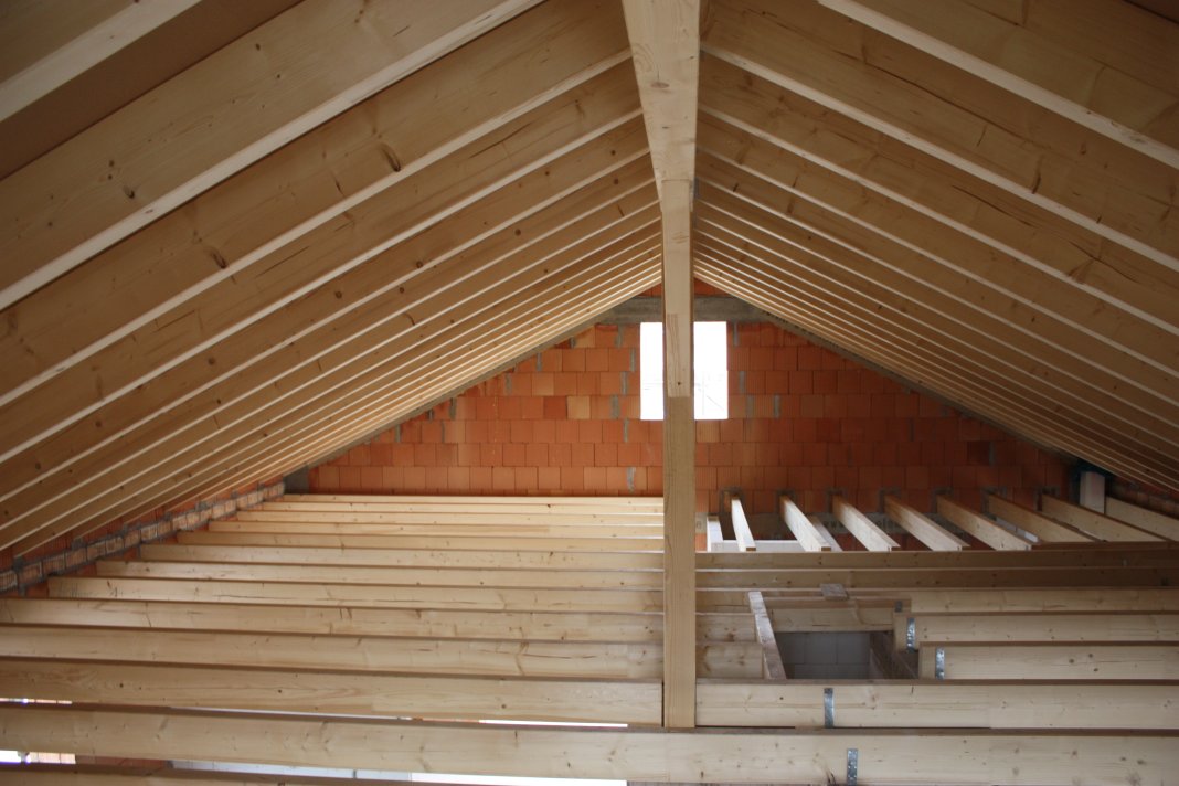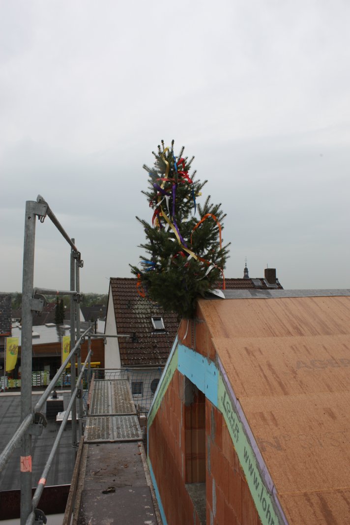 Der Richtbaum wurde geschmückt an den First geschraubt. Geschlossen macht der Dachstuhl richtig was her.