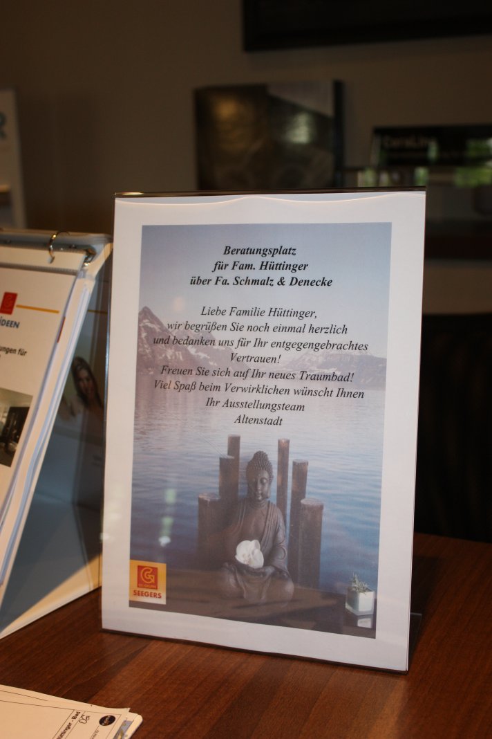 Heute hatten wir einen Termin beim Sanitäreinrichtungshaus, dort haben wir uns in Altenstadt die Bad- Ideen-Ausstellung angeschaut und anschließend einen Beraterungstermin wahrgenommen.Wie ich es sonst nur von Dienstreisen kenne, gab es ein Empfangschild, das uns persönlich begrüßte.