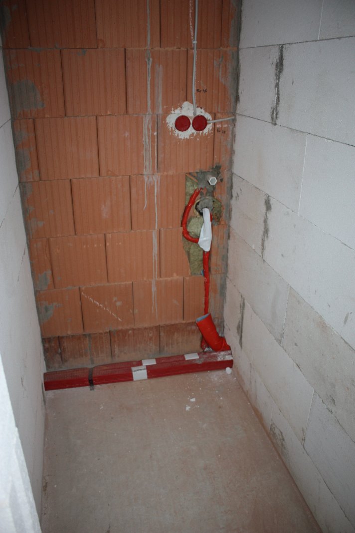 Auf der Baustelle war die FA Schmalz wieder mit vier Mann am Werken. Im Bad im Obergeschoss ist der Wasseranschluss und Abfluss im Vorratsraum für Waschmaschine fertig gestellt worden.