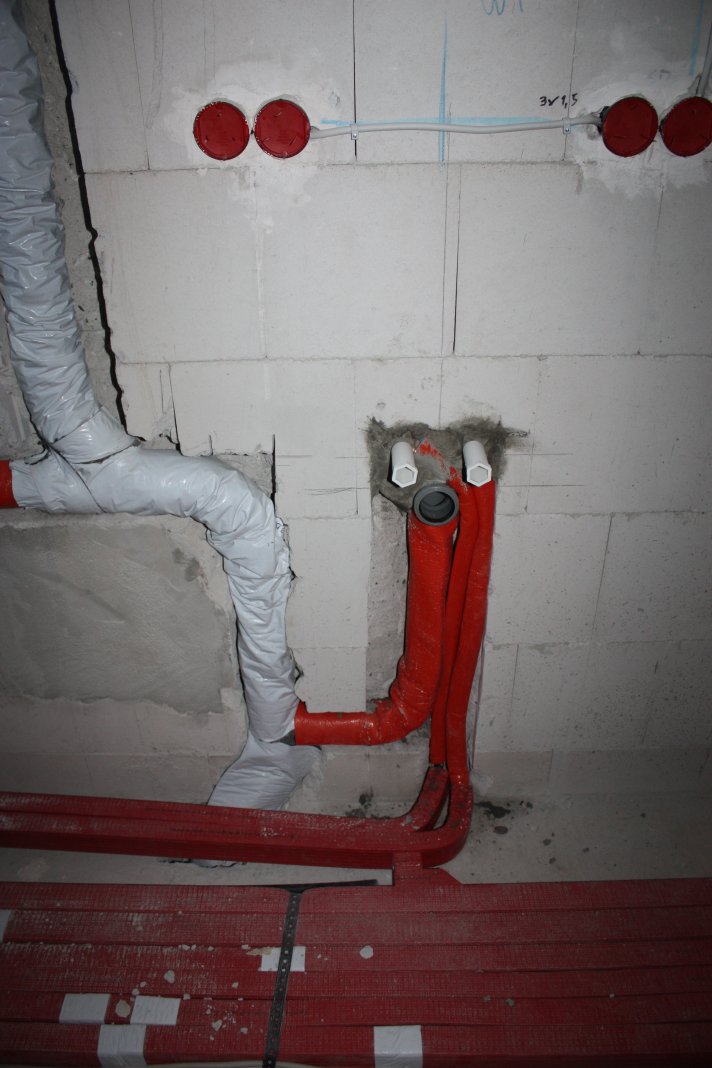 Im Erdgeschoss sind der Klohalter montiert und die Heizungszu- und ableitung bis in den Keller geführt, sowie die Wasseranschlüsse für Waschmaschine und Waschbecken verlegt worden.