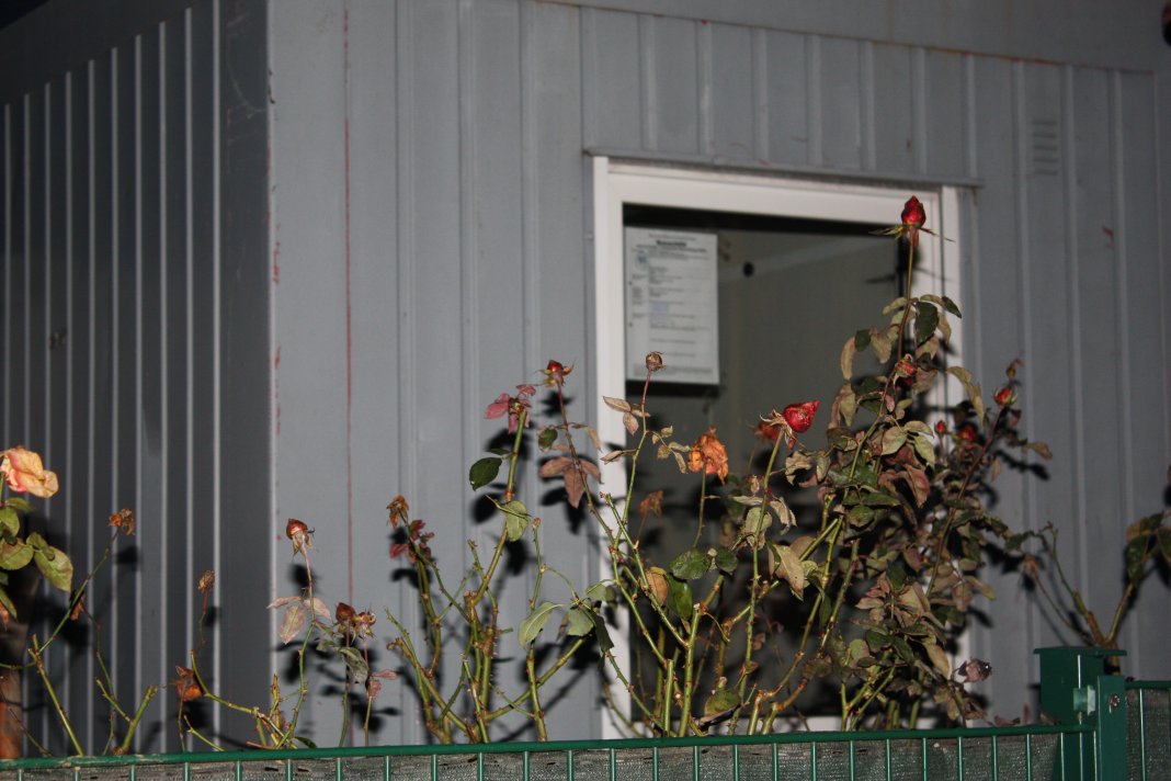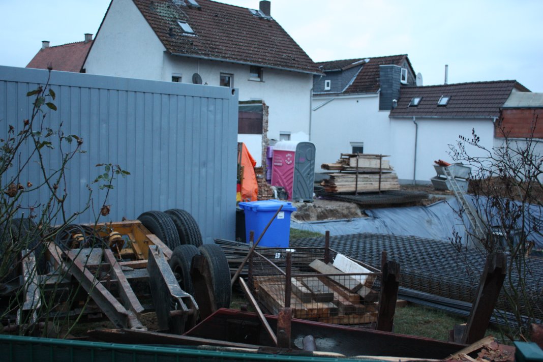 Neben dem Hof ist auch der Garten mit Material gefüllt und das Bauschild ist ins Fenster des Aufenthaltraumes umgehängt worden.
