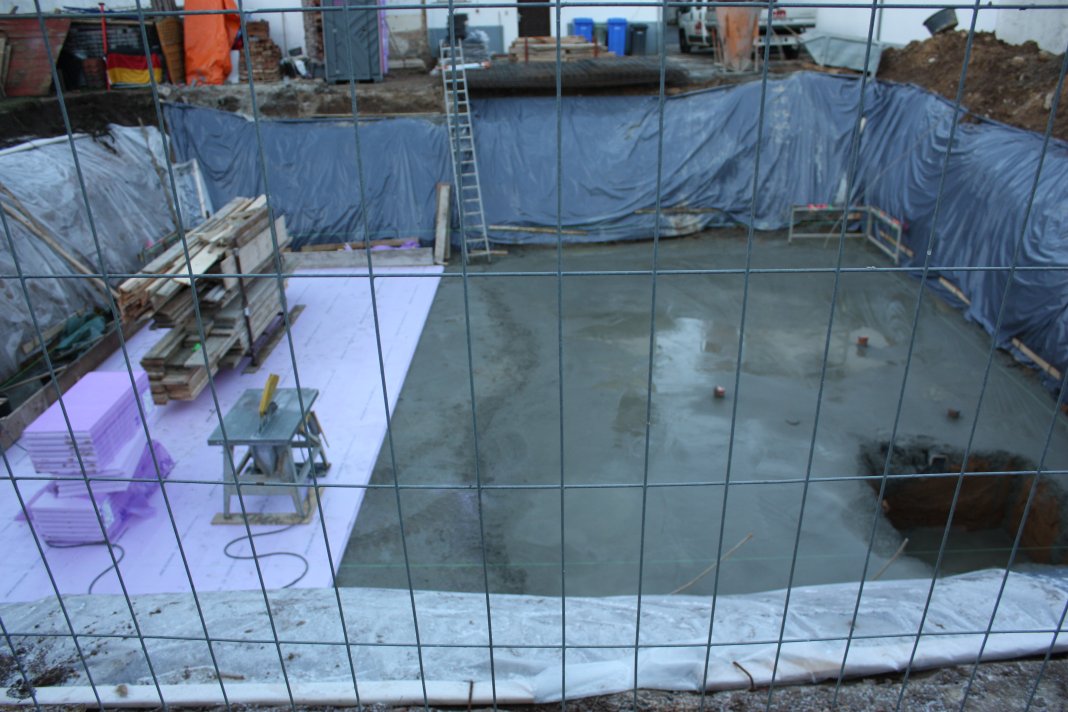 Wir haben gelernt, dass wir gar keinen Schotter unter der Bodenplatte benötigen, denn die Sauberkeitsschicht bietet eine waageerechte Fläche, auf die anschließend die Isolation der Bodenplatte (extrudierter Hardschaum) vollflächig ausgelegt werden.