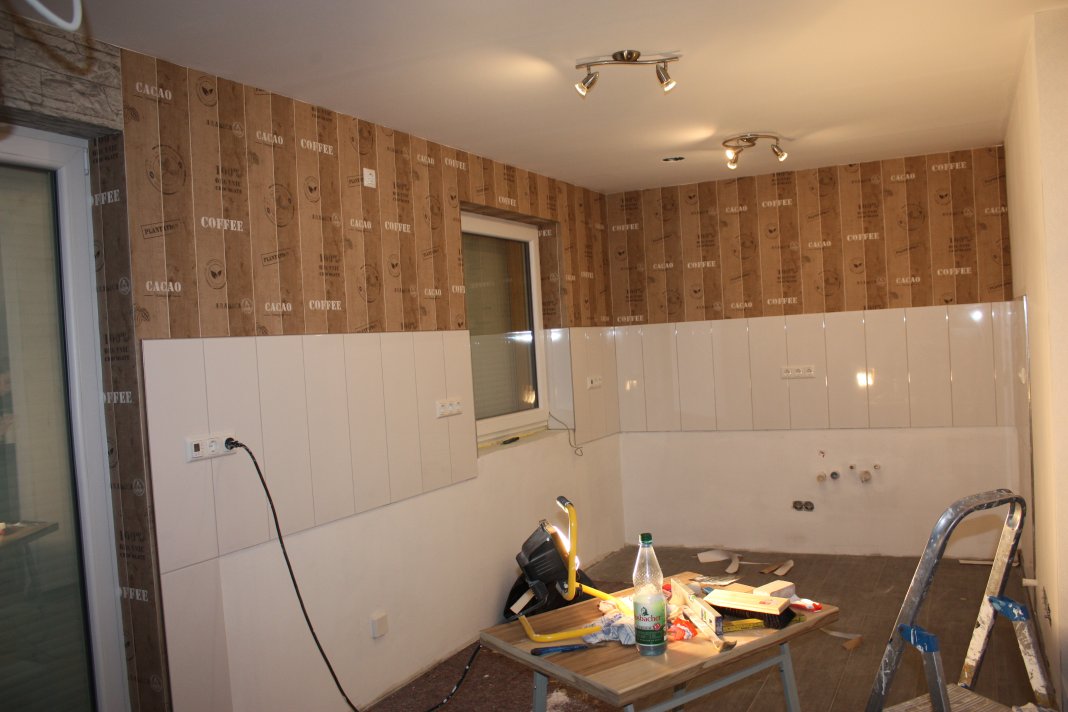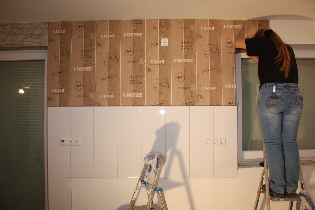Und weiter ging es mit der Tapete für die Küche, bei der wir uns einen Holzkisten- Look mit Coffee- Aufdruck ausgesucht haben… und auch das sah nach Fertigstellung BOMBE aus. Hat ja auch nur bis 1:20 Uhr gedauert…