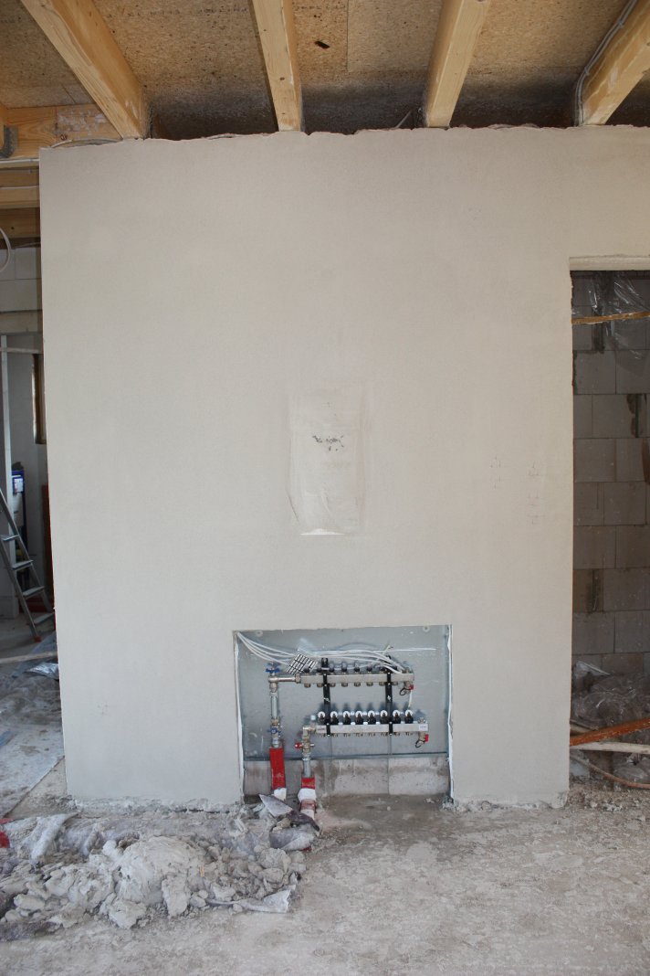 Die Verputzer haben im OG schwer zu kämpfen, die Steckdosen haben wir bis zu 2cm rausschauen lassen, das führt zu enormen Putzmengen an der Wand. Wir sind daher aufgefordert nachzuarbeiten.