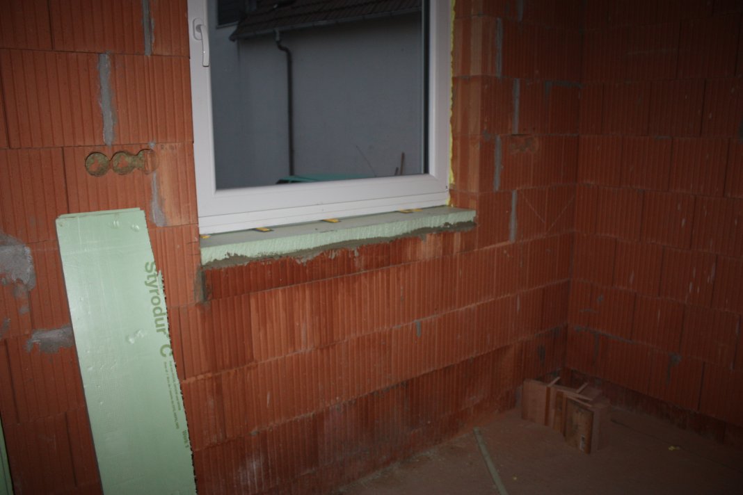 Vorher habe ich mit Fliesenkleber eine Styrodurplatte unter das Küchenfenster geklebt.